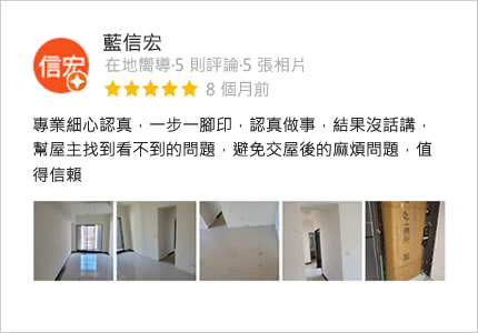 隨著現型態屋主對住屋品質的要求,也間接讓建商對自家品質的重視,在我們團隊專業的協助下為屋主把關,讓屋主能安心入住,也希望建築工程品質可以越來越好,讓購屋者都能安心入住的居家環境。